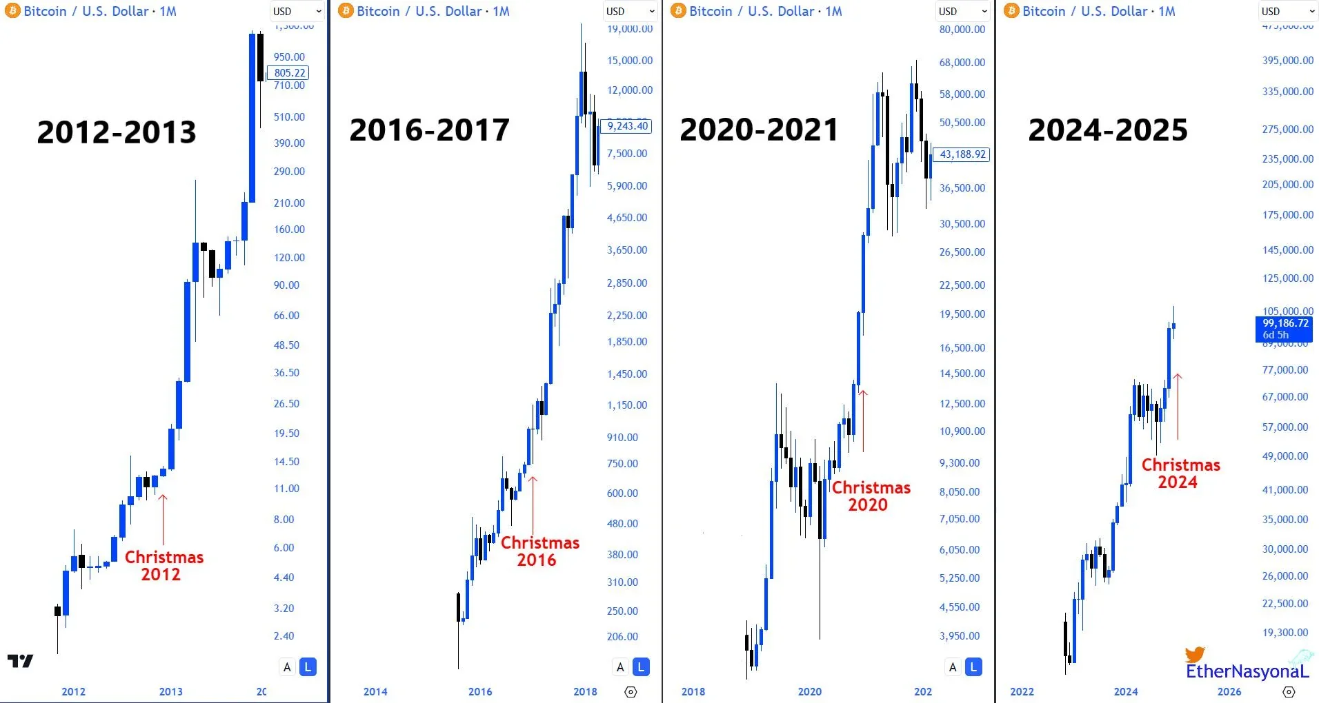 **Trends**: BTC's Christmas prices show a clear 4-year cycle tied to halvings (2012, 2016, 2020, 2024). Average YoY growth since 2010 is massive (~1,200%), but with volatility—6 out of 15 years saw declines. Long-term, it's up over 39,000,000% from 2010! Analysis from experts like those at CCN suggests 2025 could see $80K–$150K by Christmas, depending on ETF inflows and regulation.